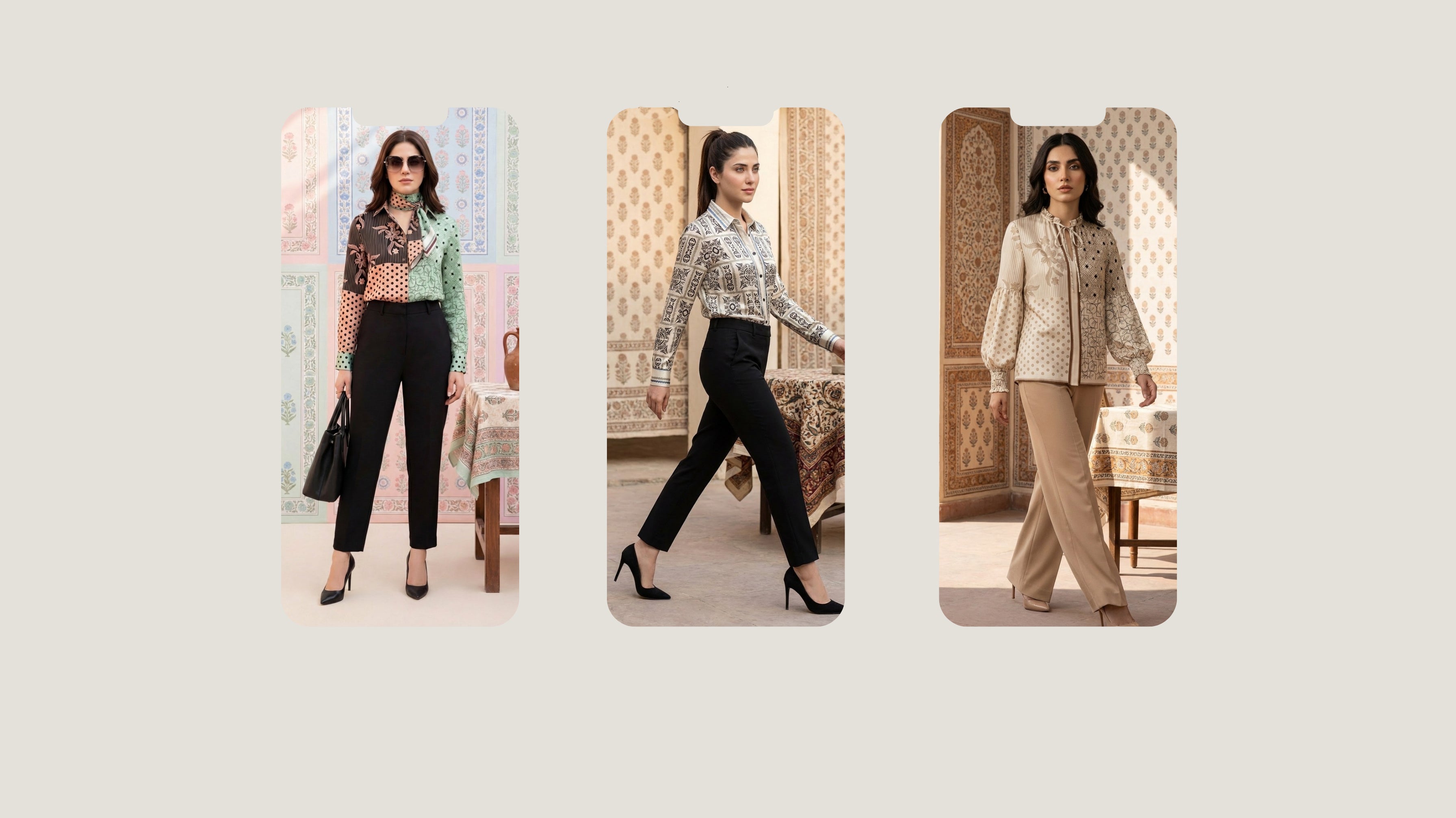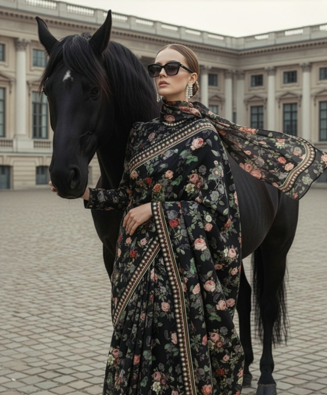 A gentle harmony of silk, colour, and imagination — each piece reflects the essence of modern femininity and artistic grace. Step into a world where tradition meets digital innovation.